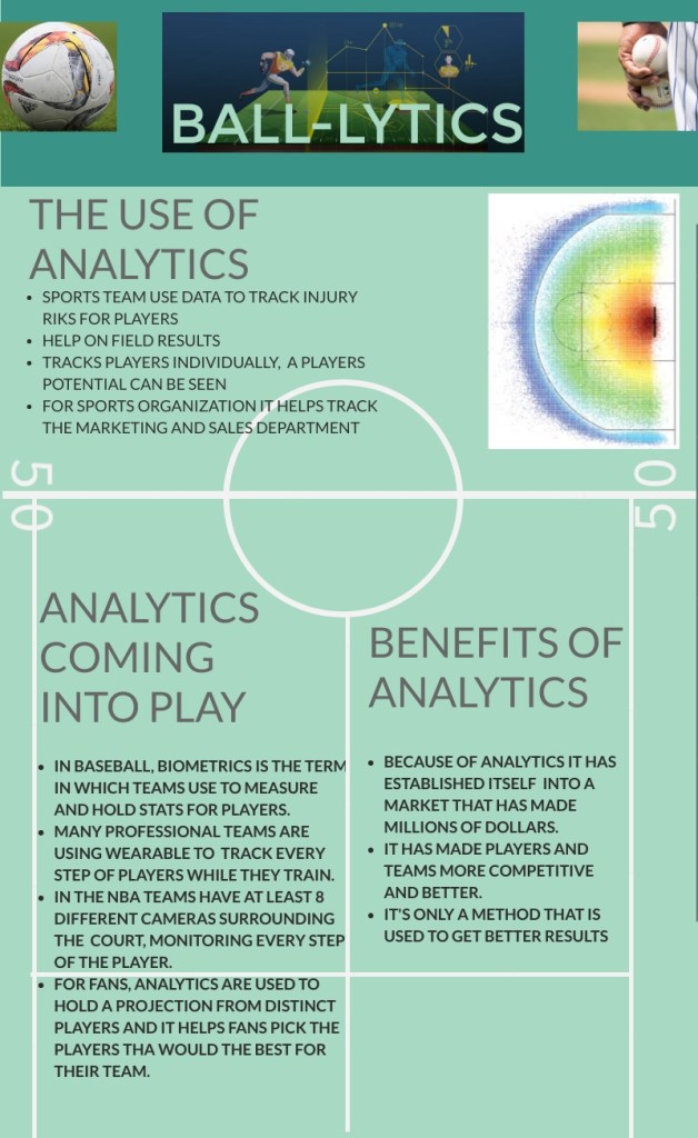 This infographic was done by me, and I made it for one of my classes and it was made as a research assignment in a topic of my choosing. So for my project I decided to make an infographic of the use of analytics in sports. I decided to make this it was something that I have some interest in and it was something that I wouldn’t mind doing. The points that I wanted to cover in this infographic was the benefits of analytics, how it comes into play in different sports and how analytics are used by different sport teams. By having these topics that I wanted to cover in the infographic, I had to be very selective in what to put in the graphic because too many words would not catch a reader’s attention and they would not want to read everything that would be put on a graphic. Apart from having words in the infographic an important aspect is having pictures and a layout so it easily catches the reader’s attention and makes them want to read and view the graphic. So within this infographic I tried to cover all the important points that I did based on my research, and with that information I put that in an infographic where it can catch the attention of reader who can learn some interesting facts of sports analytics.